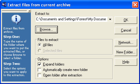 Click 'Browse' and select a folder for the extracted files. That's it. If you want to use more features of Zip Central, or my instructions were too terse, there is an On-Line Manual (FAQ) accessible from your START button or the 'Help' tab from the program menu. Don't try their web page -- it has disappeared. |