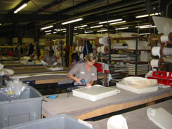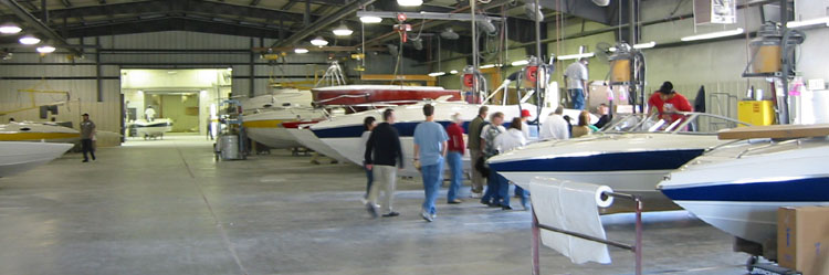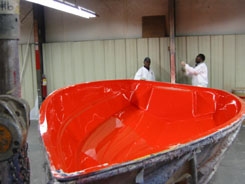 | The factory tour showed how a boat is built from scratch to the finished product. The process starts with a bare form which is coated, from the outside in, with gelcoat, a thin layer and a thick layer of fiberglass. | |||